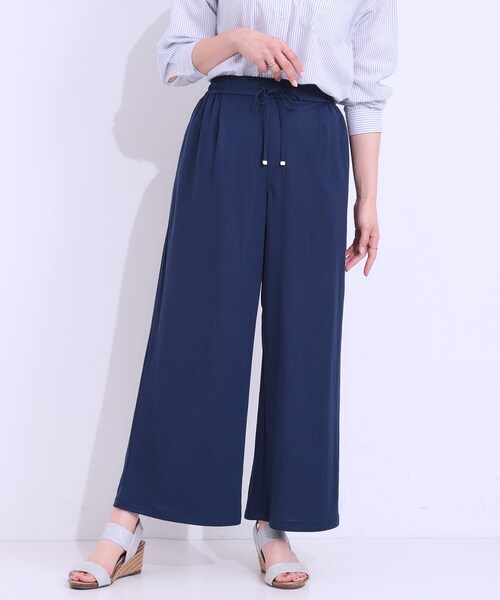 自分好みの丈を選べる、女性らしさのあるリラクシーなワイドパンツ。 【デザイン】 カジュアルなディテールながらも女性らしいニュアンスに仕上がる1枚。 ゆったりデザインのワイドパンツなので、脚のシルエットを拾いにくく自然に体型カバーが叶います。 ストンとした落ち感があり、スタイルアップ効果も。 太すぎず細すぎない、絶妙なワイドシルエットとウエストタックデザインですっきりとした印象。 着丈はレギュラー丈・ショート丈の2丈から選べます。 ショート丈は、短い丈となります。(着丈以外は同じサイズ) 後ろウエスト部分は、ゴム仕様で楽に着用いただけます。 触れた瞬間ひんやりする接触冷感機能付きも嬉しいポイント。 【スタイリング】 ブラウスや5分袖ニットにパンプスやヒールのサンダルを合わせた大人のきれいめカジュアルな着こなしがおすすめ。 チュニックの下にレイヤードしたリラクシーなスタイルもサマになります。 Tシャツ合わせのカジュアルコーデにもマッチ。 上品で大人っぽく決まる、幅広く着こなせる1枚です。 【お客様からいただいたコメント】 ・紺色に一目惚れ。 ひんやり素材で洗濯機でも洗えるので、即決で買わせていただきました。 カジュアルでも、綺麗系でもコーデがしやすいです。 (身長:161cm 体型:普通 ネイビーのMサイズ購入) とのお声を頂戴しております。 【素材】 少し伸縮性のあるレーヨン・ナイロンのカットソー素材を使用しています。 夏場に嬉しい、触れた瞬間ひんやりする接触冷感機能付き。 【仕様】 ・ポケット数:横×2 ・ウエスト後ろゴム ・裏地なし ※こちらの商品はやや透け感があるため、インナーの着用をおすすめします。 ※照明の関係により、実際よりも色味が違って見える場合があります。また、パソコン・スマートフォンなどの環境により、若干製品と画像のカラーが異なる場合もございます。 モデル情報:身長163cm B81 W59 H88 着用サイズ:02(M) 店舗へのお問い合わせ商品番号:741-62040 ●製品寸法: 01(S):W65~97cm H108cm 股下64cm 前股上29cm 渡り幅36cm 裾幅31cm 02(M):W68~100cm H111cm 股下65cm 前股上29cm 渡り幅37cm 裾幅32cm 03(L):W71~103cm H114cm 股下66cm 前股上30cm 渡り幅38cm 裾幅33cm 04(LL):W74~106cm H117cm 股下67cm 前股上30cm 渡り幅40cm 裾幅33cm 36(Sショート丈):W65~97cm H108cm 股下54cm 前股上29cm 渡り幅36cm 裾幅31cm 38(Mショート丈):W68~100cm H111cm 股下55cm 前股上29cm 渡り幅37cm 裾幅32cm 40(Lショート丈):W71~103cm H114cm 股下56cm 前股上30cm 渡り幅38cm 裾幅33cm 42(LLショート丈):W74~106cm H117cm 股下57cm 前股上30cm 渡り幅40cm 裾幅33cm 備考: