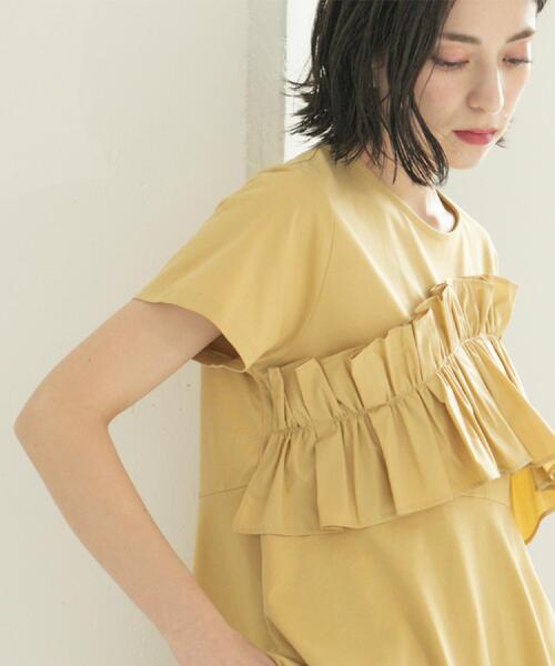 異素材フリルが華やかなドッキングペプラムトップス 【デザイン】 ・アシンメトリー状に異素材フリルをあしらった華やかなドッキングカットソー。 ・高めのウエスト位置で切替たペプラムデザインでスタイルアップも期待できるデザイン。 ・後ろ身頃にかけてやや長めにした着丈で、ヒップラインもカバーできるデザイン。 ・ペプラムデザインなのでパンツとのスタイリングがおすすめ。きれいめにもカジュアルにも相性の良いデザイントップスです。 ・1枚で着映えする華やかなデザインカットソーです。 【素材】 ・肌触りの良いコットン/ポリエステル混のカットソー素材。 ・フリル部分には、ハリ感のあるシャツ地素材を使用。 ・カットソー素材には、接触冷感機能。 ・マシンウォッシャブルでご自宅でのお洗濯も可能。 ※照明の関係により、実際よりも色味が違って見える場合があります。また、パソコン・スマートフォンなどの環境により、若干製品と画像のカラーが異なる場合もございます。 モデル情報:身長163cm B82 W62 H91 着用サイズ:38(M) 店舗へのお問い合わせ商品番号:637-12285 ●製品寸法: 38(M):着丈前63cm 着丈後68cm B96cm 袖丈18cm 肩幅38cm 40(L):着丈前65cm 着丈後70cm B99cm 袖丈19cm 肩幅39cm 42(LL):着丈前65cm 着丈後70cm B102cm 袖丈19cm 肩幅40cm 備考: