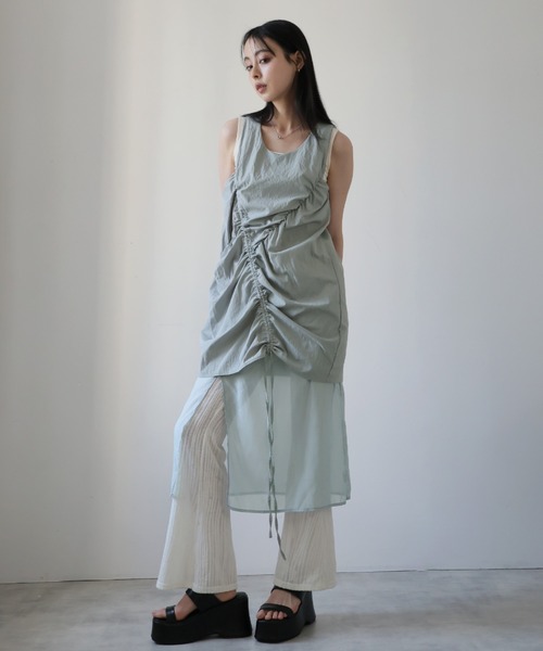 重ねることで引き立つ、洗練されたモードスタイル。■デザイン・シンプルなノースリーブのドロストワンピースと、シアー感を強調したインナーキャミワンピースの2点セット。・シャーリングデザインを施したノースリーブワンピースは、シルエット調整が可能で、モード感溢れる立体的なラインを実現。・インナーのシアーキャミワンピースは、裾のスリットデザインが 動きのあるディテールを生み出し、光沢感を与えながらシンプルに引き立てます。・シアー素材の透明感とドロストディテールが絶妙に融合し、レイヤードすることで一気にエッジィな印象に。■素材・ノースリーブワンピースは、さらりとしたポリエステル素材で、流れるようなラインとクールな印象を与えます。・インナーキャミは重ねてももたつかず、しなやかな着心地で快適。■スタイリング・シンプルにセットで着こなすことで、最旬のモードスタイルが完成。・スニーカーやローファーでカジュアルダウン、サンダルやポインテッドパンプスで綺麗めに。・ボトムスはデニムやフレアパンツ、スラックスとのレイヤードコーデもトレンドライク。-----------------------------透け感:一部あり伸縮性:なし裏地:なし------------------------------------------------------------【スタッフが着用しました!】身長:158cm普段着用サイズ:S~Mサイズ今回着用サイズ:FREEサイズ■着用感・インナーワンピがひざ丈位、ノースリーブワンピが膝上のミニ丈でした◎・レイヤード感がありつつも、軽やかな着心地で、 リラックスした中にも強さを感じさせるアイテムです。・一癖あるデザイン性の高いアイテムで、合わせるだけでおしゃれ見えするセットアイテム。※取り扱い上のご注意染色の特性上、発汗や摩擦により色落ちしたり他のものに色移りすることがありますのでご注意ください。------------------------------------------------【お買い物をよりお楽しみいただく為に】▼お気に入り登録サイズ・カラーを指定して、♡マークをクリック![セール通知・ラスト1点の通知・完売アイテムの再入荷通知]を受け取ることができます。▼ブランドのお気に入り登録新商品や再入荷、タイムセールやクーポン等いち早くブランドのお得な情報を受け取ることができます。------------------------------------------------韓国 オフィスカジュアル春服 ガーリー大人カジュアル