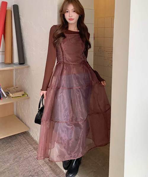 「透け感とレイヤードを楽しむ、2枚セットの大人フェミニンスタイル。」■デザイン・ベーシックなロングスリーブカットソーと、シアー素材のフレアワンピースがセットになったアイテム。・ワンピースは柔らかな透け感のある素材を使用し、軽やかなフレアシルエットが魅力。・編み上げデザインがアクセントになり、細部まで抜かりなくおしゃれ。・カットソーはシンプルで着回し力抜群。インナーとしても一枚でも活躍するデザイン。・トレンド感のあるレイヤードスタイルが楽しめます。■素材・ロングスリーブカットソーはコットンポリエステル素材で、柔らかく肌当たりの良い着心地。・ワンピースはポリエステルの軽やかでふんわりとしたシアー素材。・透け感がありながらも、しっかりとした縫製で安心感も◎。・両素材ともシーズンレスで使いやすく、お手入れも簡単。■スタイリング・セットで着れば、透け感のある大人フェミニンなレイヤードコーデが即完成。・ボトムはデニムパンツやスラックスに合わせて、カジュアルダウンしたコーデもおすすめ。・カットソーは別のワンピースやキャミトップスと合わせても◎。・ワンピースはシンプルなTシャツやタンクトップに重ねて、夏の軽やかコーデにも活躍。・フラットシューズやサンダル、スニーカーまで幅広くマッチ。-----------------------------透け感:ややあり伸縮性:なし裏地:なし------------------------------------------------------------【スタッフが着用しました!】身長:158cm普段着用サイズ:S~Mサイズ今回着用サイズ:FREEサイズ■着用感・カットソーはやわらかくストレッチ性もあり、長時間着ても快適。・ワンピースはふんわりと軽い着心地で、動くたびに揺れるシルエットが女性らしさをプラス。・編み上げ部分でウエストを絞ってシルエット調整もでき、スタイルアップ効果も◎。・レイヤードでも重たくならず、季節問わず楽しめるバランス感。------------------------------------------------【お買い物をよりお楽しみいただく為に】▼お気に入り登録サイズ・カラーを指定して、♡マークをクリック![セール通知・ラスト1点の通知・完売アイテムの再入荷通知]を受け取ることができます。▼ブランドのお気に入り登録新商品や再入荷、タイムセールやクーポン等いち早くブランドのお得な情報を受け取ることができます。------------------------------------------------韓国 オフィスカジュアル春服 ガーリー大人カジュアル