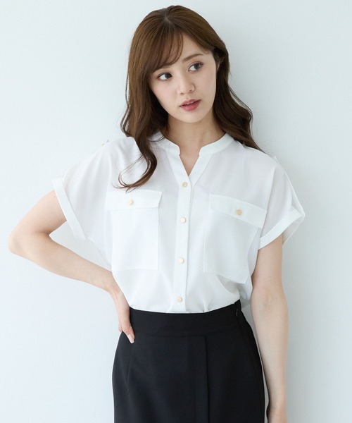 金ボタンをアクセントにしたサファリデザインブラウス。シャツデザインで洗練された雰囲気に、柔らかな素材を掛け合わせた知的でレディな一枚。顔回りがすっきり見えるスキッパーネックと胸ポケットで目線を上げ、フレンチ袖はさりげなく二の腕をカバーしてくれます。梅雨のジメジメや真夏の暑さも吹き飛ばすような、さらりとした着心地と肌離れの良さも魅力。■STYLINGさらりとアウトで着流せば風を含み清涼感たっぷり。デニムやハーフパンツ、Iラインボトムが好相性。フレアスカートや、アウターを羽織るようなきちんとしたスタイルにはインがおすすめ。腰回りがもたつかないすっきりとした素材感も◎■SCENEオフィス、商談、ショッピング、デート、どんな場面にも似合います。