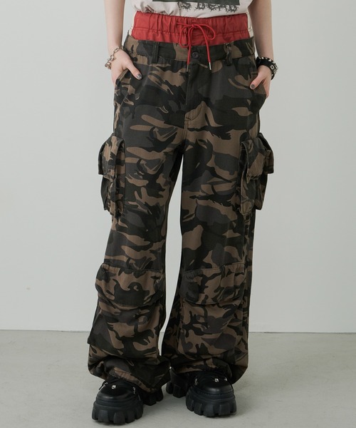 【AIVER カモレイヤードカーゴパンツ】カモフラージュ柄をプリントした生地にストーンウォッシュ加工を施した素材を使用。洗いをかけているためくたっとした柔らかい質感で穿きやすいワイドパンツ。また表面が白っぽく、生地が重なっている箇所はアタリがあり、生地の擦れ感がちゃんと出るよう強めに加工を加えたデザインが特徴。インナーにジャージのようなラインパンツを重ねたカーゴパンツとのレイヤードデザインが特徴。カーゴパンツにはポケットを10個取り付けた仕様。ポケットは太もも部分に縦長のポケットを2つ横に並べ、ひざ下に横ではなく前部分に大き目のポケットを配置。ポケットはマチ付きでボリュームがあり、フラップ部分にはスナップボタン付き。パンツ裾内側に紐を通し、絞ってシルエットの変更可能。ラインパンツ部分のウエストはゴムで仕立て、更に紐を通しベルトがなくてもそのまま穿けるイージー仕様。ラインパンツとカーゴパンツのレイヤード部分は約6cm。カーゴパンツ部分のウエストや股上はレイヤードを綺麗に見せるようサイズを微調整し、本当にレイヤードしているような仕上がり。カモチャコールグレー×オレンジ、カモカーキ)×オレンジの2色展開。<問い合わせ番号/ACIZI252001/AC00000073><補足スペック>・ウエスト S/ジャージ66cm~78cm,カモ80cm M/ジャージ72cm~84cm,カモ86cm L/ジャージ78cm~90cm,カモ92cm・股上 S/ジャージ36cmカモ30cm M/ジャージ37cmカモ31cm L/ジャージ38cmカモ32cm・ヒップ(上から20cm下位置) S/104cm M/110cm L/116cm※目安です。0.5~1cm程度の誤差がある場合があります。※別々での使用、また取り外しはできません。※着用中、発汗、摩擦により脱色したり、他の衣類に移染する事があります。特に着用時のバックや衣類等の摩擦には、十分に注意して下さい。※画像つきましては、光の反射などによって実物と色味が異なって見える場合があります。※商品画像はサンプルの為、色味やサイズ等の仕様に変更がある場合があります。※繊維製品の為1~2cmの誤差がある場合があります。予めご了承下さい。<商品のお気に入り登録>再入荷、残り1点、セールなどの通知を受け取ることが出来ます。<ブランドお気に入り登録>新商品や再入荷、ショップのおすすめトピックスなど、いち早くブランドのお得な情報を受け取ることが出来ます。