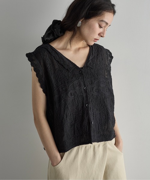 THE YOn 2025 Summer Collection たっぷりとあしらった刺繍がポイント 【Design】 モチーフの異なるコード刺繍を組み合わせた、ニュアンスの効いたルックが魅力のコットンブラウス。 透けのある生地感やスカラップデザインの甘さを、オーバーなサイジングで程よくカジュアルダウン。 首元は広めのVネックにデザインし抜けのある印象に。 バックにも刺繍をあしらい抜かりなく仕上げました。 【Styling Point】 定番のデニム合わせや、イージーパンツを合わせたリラックス感のある着こなしもおすすめ。 タックアウトでもバランスの取れる絶妙な丈感も魅力。 ---------------------------- 裏地:なし 光沢感:なし 透け感:ややあり 伸縮性:なし 生地の厚さ:やや薄手 ----------------------------- 【お買い物をお楽しみいただく為に】 ▼お気に入り登録をオススメ致します。 『♡』をクリックして下さい。 ・《商品のお気に入り登録》で再入荷通知や、ラスト1点の通知、セールの際の通知も受け取ることができます。 ・《ブランドのお気に入り登録》で新作商品や再入荷など、お得な情報を受け取ることができます。 【ATTENTION】 ※生地の特性上IVORYの生地の表面に黒い点のようなものが見られる場合がありますが、品質には問題ありません。 ※画像の商品はサンプルです。 実際の商品と色味、仕様、加工、サイズ、素材等が若干異なる場合がございます。 ※撮影場所やお使いのモニター環境により若干お色味が異なる場合がございます。 ※製品によっては染料の特性上、湿った状態や汗をかいた状態での長時間の放置、または摩擦により、他のものへ色移りする恐れがありますので、着用時にはご注意下さい。 ※お洗濯は洗濯ネットを使用し、他のものとの混合洗いはお避け下さい。色落ちや色移りの原因となります。 タンブラー乾燥はお避け下さい。 ※風通しがよく、湿気の少ない日の当たらない場所で保管して下さい。 ※また製品加工上、お手元に届く際に匂いが生じる場合がありますが、 ご使用を続けていく事により匂いは軽減されます。