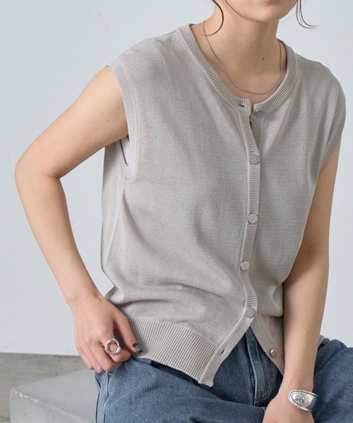 【いつものコーデにプラスワン!涼しげなニットボタンベスト】シーズンムード漂うニットボタンベスト。お手持ちのキャミやタンク、Tシャツと合わせるだけで一気におしゃれ見えしてくれるアイテム。ボタンの開け方次第で雰囲気が変わるのも魅力◎涼し気に着られる1着は、真夏まで活躍してくれます。【商品ポイント】・ドライタッチな生地感・フロントボタンがアクセントに・旬なレイヤードコーデを楽しめるアイテム----------------------------------------------------■商品特徴洗濯方法:手洗い可裏地:なし透け感:あり伸縮性:あり光沢感:あり(ボタン)生地の厚さ:やや薄め----------------------------------------------------■素材レーヨン89%,ナイロン11%----------------------------------------------------※着用、お取り扱いの際は、商品についている品質表示とアテンションタグを必ずご確認下さい。※商品タグに記載されている商品名がWEBでの表記名と異なる場合があります。※画像の商品はサンプルです。実際の商品と仕様、加工、サイズが若干異なる場合がございます。 ※照明の関係により、実際よりもやや明るく見える場合がございます。またパソコンなどの環境により、若干製品と画像のカラーが異なる場合もございます。予めご了承くださいませ。【お気に入り登録】してお得な情報をCHECK!!・「商品のお気に入り登録」で再入荷通知や、ラストの通知、セール通知も受け取ることができます。・「ブランドのお気に入り登録」で新商品や再入荷など、お得な情報を受け取ることができます。