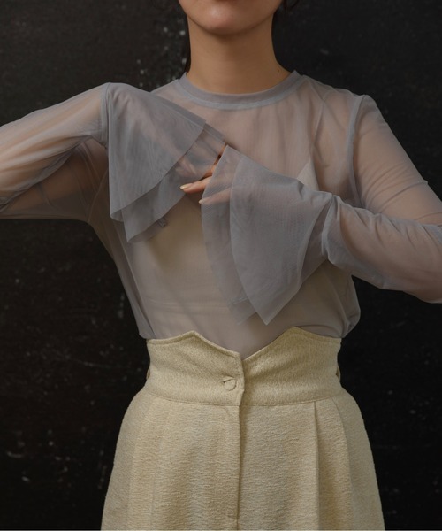 【メッシュフレアロングtシャツ】・メッシュの透け感により上品な肌見せが叶うロングTシャツ・袖口に施されたフレアデザインが女性らしさを演出・伸縮性に優れており優しく体にフィットし、さらっと滑らかな肌触り・シーズンレスでお召しいただけるレイヤードスタイルにも欠かせない一着透け感:あり 伸縮性:あり
