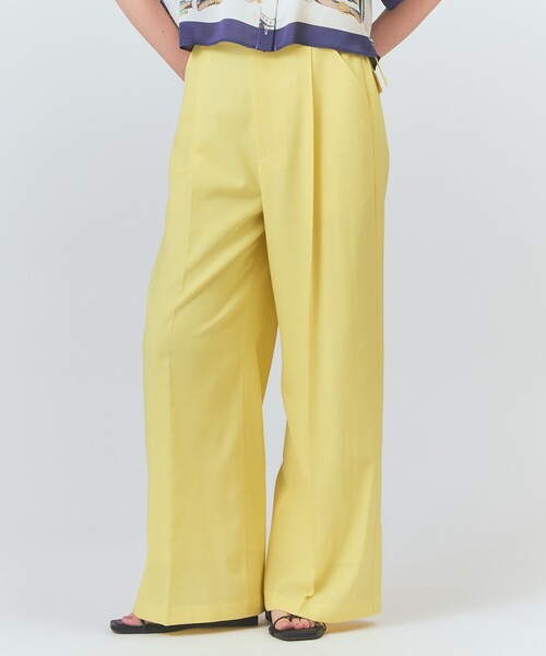 【Japan Fabric】 ナチュラルな風合いを持ちながら上質感を感じる、ソフトな風合いのスラブコットン糸を使用したワイドパンツ。ウエストにはゴールドメタルのマリンボタンをトッピングした、大人な洗練感のある夏らしい一本です。トップスインがスマートに映えるトレンドのハイウエスト型で、今の気分たっぷりに仕上げました。リラックス感のあるワイドなシルエットながら、センタープレスを入れる事でルーズになり過ぎず、きちんと見えも同時に叶えてくれるのも魅力。シックな大人の夏コーデに投入したいブラック、ボーダーアイテムなどと合わせたいホワイト、おしゃれな差し色にぴったりなイエローの3色をご用意しました。コーディネートの主役にも脇役にもなれる、この春の注目パンツです。※こちらの画像はサンプル品を撮影しております。実際の商品と仕様、加工、サイズが若干異なる場合がございます。予めご了承くださいませ。洗濯表示洗濯不可 漂白不可 タンブル乾燥不可 アイロンは120℃まで 弱いドライクリーニング(石油系)可