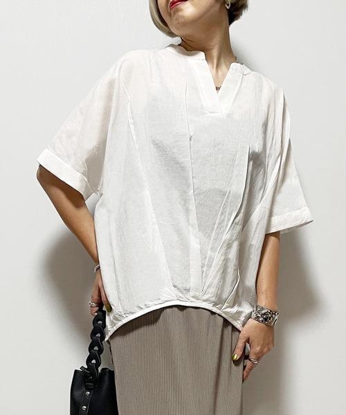 ◆万能サマーブラウス◆ 【ディテール】ウエストのタックデザインがワンポイントのブラウス。前後差のある着丈はさりげなくボディラインカバーしてくれます。首元はバンドカラー&スキッパーデザインになっているのですっきり着こなせます。 【ファブリック】 ハリ感のある綿100%のキャンブリック素材がシーズンムードたっぷりです。 #オフィスカジュアル