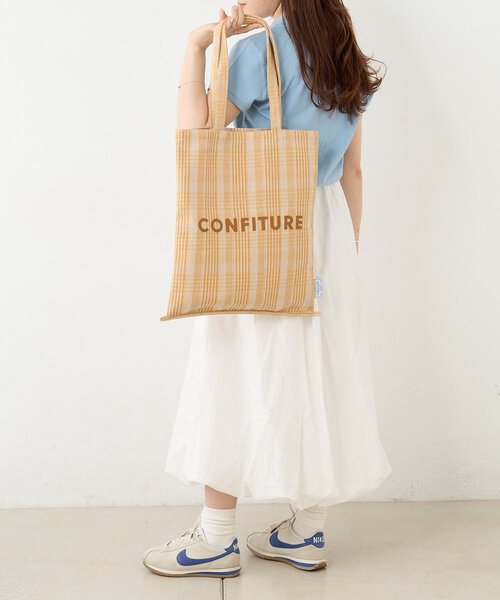 パリの食材店をイメージしたフレンチエピスリーシリーズ ジャガード素材のナチュラルなチェック柄トート。大きめサイズで収納力も抜群です。 フランス語のチェーンステッチ刺繍がおしゃれなデザイン。 主役バッグとしてはもちろん、ミニバッグと一緒に持つのも◎ 〇デザイン BAGUETTE:フランスパン CONFITURE:コンフィチュール POMME:りんご CHOCOLAT:チョコレート