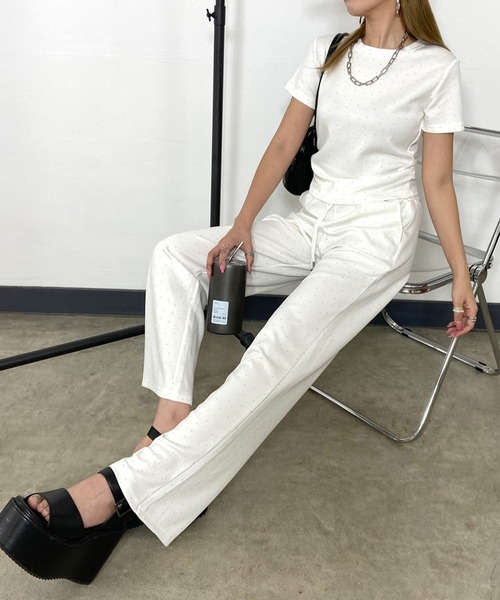 全面に散りばめられたストーンがラグジュアリーな輝きを放ち、 春服から夏服コーデのデイリースタイルを格上げしてくれるTシャツとパンツのセットアップ。 ストーンが光に反射して、 動く度にきらきらと光る表面が 女性らしい印象に。 トップスはボディに程良くフィットする コンパクトなシルエットで 華奢見え効果も◎ サイドギャザーがデザイン性をプラス。 パンツはウエストゴム仕様と ルーズなワイドシルエットで、 リラックスした穿き心地。 脚の形を拾わない太めのシルエットで、 気になる下半身を 自然とカバーしてくれるのも 嬉しいポイントです◎ 上下セットでの着用はもちろん シングルユースも出来るので、 スタイリングの幅が広がります◎ ※お取り扱い上のご注意 ストーン部分は突起物や爪などで引っかいたり、 強い摩擦を受けると、 剥離脱落する場合が御座います。 また、洗濯機使用ではなく、 手洗いでの洗濯を推奨しておりますが、 洗濯の繰り返しにより ラインストーンが取れる場合があります。 お取り扱いにご注意ください。 【サイズ】 【トップス】着丈46cm、身幅42cm、肩幅37cm、袖丈17cm、袖幅15cm、すそ周り76cm 【パンツ】着丈99cm、ウエスト60cm(ゴム仕様)、ヒップ90cm、もも周り56cm、股上30.5cm、股下71cm、すそ周り48cm 【伸縮性】あり 【透け感】なし 【裏 地】なし ※画像の色味はお使いのパソコンやスマートフォン等のモニター環境により、 実際の色目とは若干ことなる場合がございます。 ※輸送時による、多少の汚れ・シワがある場合がございます。 ※平置きでの実寸のため、若干の誤差が生じる場合がございます。 【お買い物をよりお楽しみいただく為に!】 ▼商品のお気に入り登録 ハートをクリック! 完売カラーの再入荷や、ラスト1点の通知、セールの際の通知を 受け取る事が出来ます。 ▼ブランドのお気に入り登録 新商品や再入荷など、いち早くブランドのお得な情報を受け取る事が出来ます!