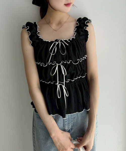 ~NICECLAUP 2025 Summer Collection~1枚でコーデの主役に!リボンとフリルが可愛いビスチェスクエアデザインでデコルテラインをすっきり見せてくれます。胸下とウエストはシャーリングデザインになっているので華奢見え効果も抜群◎程よいフィット感でストレスフリーな着心地に。裾にかけてふんわりとしているので、身体のラインを拾いにくいのも嬉しいポイントです。■オススメスタイリング夏に1枚で着るのはもちろん、コンパクトなカットソーやTシャツとレイヤードするのもオススメです。短めの丈なのでパンツスタイルだけではなく、タイトスカートなどとも相性抜群です。-------------裏地:なし伸縮性:あり生地の厚さ:普通生地の重さ:普通洗濯 :手洗い-------------※サンプルでの撮影のため、実際のものと仕様や色が異なる場合があります。※室内、室外での撮影のため実際より明るく映っていたり、暗く映っていたりする場合がございます。※品質表示を必ずご確認下さい。【商品のお気に入り登録】完売カラーの再入荷や、ラスト1点のお知らせ、セールの通知を受け取ることができます。【ブランドのお気に入り登録】新作入荷や再入荷情報など、ブランドの情報をいち早くお届けします。ぜひご登録ください♪2025SS