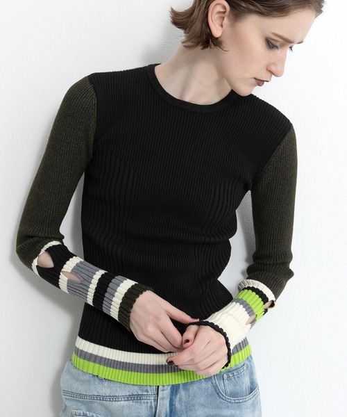 毎年大人気の12Gカラーブロックリブニット。今年は身頃と袖が配色で、左右の袖口がアシンメトリーなマルチボーダー、裾の3本配色ラインがポイント。今シーズンは、ヴィンテージ感あるレトロなカラーリング。身頃は中央が細リブ、サイドが胸下に斜めに太リブで、細見え効果のある変形リブ柄に編立ている。肉厚で身体のラインを拾い過ぎず、着やすいクルーネックで展開。もちもちした肌触りの良いニット。※生産の都合上、商品の納期が変更となる場合がございます。※商品の画像はサンプルのため、実際の製品とは仕様や加工、サイズ等が若干異なる場合がございます。