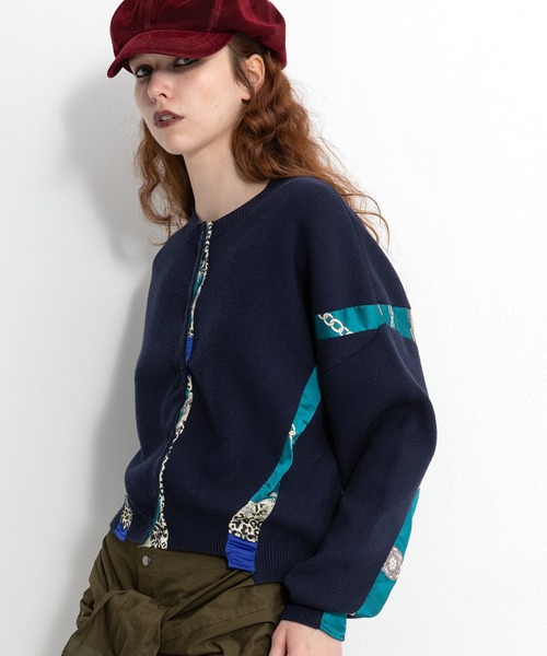 スカーフプリントのコンビネーション2WAYニット。チェーンやベルト柄のスカーフプリントが、ヴィンテージ風の仕上がりで新鮮。前後どちらでも着れる2WAYで、リングドット釦の方は、カーディガンでも着用可能。プルオーバー着用の方は、アシンメトリーにプリントが剥がれているデザイン。ショート丈なので、ボリュームのあるボトムとのコーデがおすすめ。12Gのゴム編みなので、ダレにくく伸縮性も〇。モチモチした肌触りが心地よく、起毛感が温かみのある1枚。※製品は1枚1枚スカーフ柄の位置が異なる仕様となっております。※生産の都合上、商品の納期が変更となる場合がございます。※商品の画像はサンプルのため、実際の製品とは仕様や加工、サイズ等が若干異なる場合がございます。