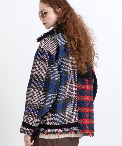 左右で中柄と大柄の2種類の大胆なチェックを使用し、中央には無地モッサを組み合わせたマルチコンビネーションブルゾン。カラーもマルチで他にはない目を惹くデザインが毎シーズン人気のおすすめアイテム。フロントは斜めのジップ開きで、ライダースデザインの上襟はくるくるとした羊のフェイクファーがウォーム感を出してくれる。右身頃はツイードチェック生地のフリンジがアクセントになったフラップポケット付きジャケット。左身頃は、裾と袖口にライン入りのアシンメトリーデザイン。※生産の都合上、商品の納期が変更となる場合がございます。※商品の画像はサンプルのため、実際の製品とは仕様や加工、サイズ等が若干異なる場合がございます。