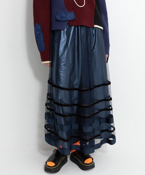 太グログランリボン、細ベルベットリボンを配色でボーダー状に裾に叩いたチュールスカート。タックやギャザーでボリュームたっぷりなふんわりしたシルエットで歩くと揺れる女性らしいアイテム。ウエストはゴム仕様で、平コードで絞れるフリーサイズ。裏地のメタリック素材が反射して甘さを抑えたクールな印象にも。※生産の都合上、商品の納期が変更となる場合がございます。※商品の画像はサンプルのため、実際の製品とは仕様や加工、サイズ等が若干異なる場合がございます。