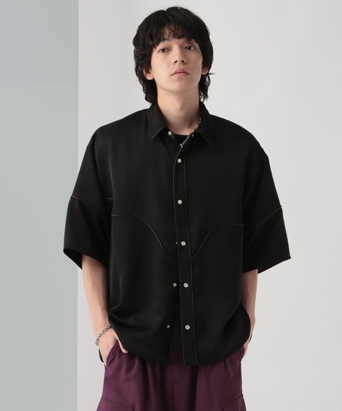 ーーー レザーのパイピングがアクセントのヴィンテージライクなウエスタンシャツ ーーー point □フェイクレザーを使用したパイピングがアクセントのデザイン。 □バックにフラシデザインを施して立体感のあるシルエットに。 □程よい光沢感とドレープ感があるポリエステル生地で色気のある雰囲気を演出。 □落ち感がありゆったりとした身幅なためラフに着用できます。