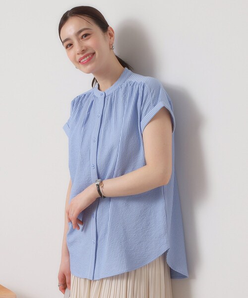 【デザイン】 洗濯時シワになりにくく、お手入れらくらくイージーケア。 カジュアル感が可愛いサッカー素材のトップス。 ぽこぽことした表面感が特徴のサッカーストライプ素材。 伸縮性のあるジャージー素材を使用しておりソフトな風合いが特徴です。 夏のカジュアルスタイルにおすすめのデザインプルオーバー。 パンツスタイルにおすすめの少し長めの丈感。 ターンバック袖でこなれ感を演出。 襟ぐりと肩・後ろヨーク切替にはギャザーを入れ立体的で柔らかなシルエットをつくりました。 【素材】 ぽこぽことした表面感が特徴のサッカー生地。 ソフトな風合いのジャージー素材です。 ※照明の関係により、実際よりも色味が違って見える場合があります。また、パソコン・スマートフォンなどの環境により、若干製品と画像のカラーが異なる場合もございます。 モデル情報:身長165cm B82 W60 H88 着用サイズ:00(フリーサイズ) 店舗へのお問い合わせ商品番号:P93-52523 ●製品寸法: 00(フリーサイズ):着丈71cm B110cm 裄丈30cm 備考: