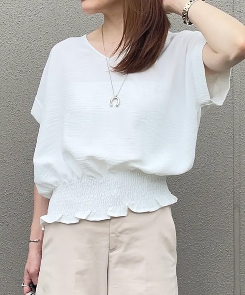 ■point・ウエストシャーリング・リネン風エンボス素材・スタイルアップ効果■detail繊細なウエストシャーリングが女性らしい美しいシルエットを引き立てるブラウスです。シャーリングデザインにより、自然にウエストラインを強調し、スタイルアップが簡単に叶う優れたアイテム。シンプルながらも、フェミニンで洗練された印象を与えてくれます。さらに、丈の調整が可能で、着こなしの幅が広がります。その日の気分に合わせてシルエットを自在に変えることができるので、コーディネートのバリエーションが増えます。ボトムスとの相性も抜群で、デニムやスカート、ワイドパンツなどと合わせるだけで、簡単にスタイルアップを実現。春夏にぴったりなエンボス加工を施したリネン風素材を使用しており、さらりとした清涼感のある肌触りが特徴です。汗をかきやすい季節でも、べたつき感を軽減してくれるので、快適に過ごせます。軽やかで通気性が良いため、これからの季節に大活躍間違いなしの一枚です。大人の女性らしい涼しげで上品なスタイリングが楽しめるブラウス。シンプルなデザインながらも、細部にこだわったディテールが、より高級感を引き立ててくれます。■fabricリネン風素材にエンボス加工を施しており、通気性がよく、さらりとした肌触りで清涼感があります。春夏の季節にぴったりな素材感で、汗をかいてもべたつきにくく、快適に着こなせます。シンプルながら、立体感のあるエンボス加工がアクセントになっており、視覚的にも美しい仕上がりです。……………………透け感:なし(淡色は若干あり)厚さ:薄手伸縮性:なし裏地:なしポケット:なし洗濯方法:手洗い推奨……………………※詳しいお手入れ方法は商品タグをご参照ください。■coordinateこのブラウスは、シンプルでありながらも女性らしい雰囲気が漂うアイテムなので、ボトムスとのコーディネートがとても楽しい一枚です。デニムと合わせてカジュアルダウンするのも良いですし、エレガントなスカートやワイドパンツと合わせて、大人の女性らしいフェミニンスタイルを楽しむこともできます。リネン風素材の爽やかさを活かして、明るいカラーのボトムスと組み合わせれば、夏のお出かけにもぴったり。シンプルなアクセサリーやサンダルを合わせることで、ナチュラルでありながらも洗練された印象を与えることができます。また、シャーリングデザインによってウエストが引き締まるので、シルエットを大切にしたい方にもおすすめ。デイリー使いはもちろん、ちょっとしたお出かけにも重宝するアイテムです。【M】着丈:58cm肩幅:59cm身幅:57cm裾幅:38cm袖口:19cm襟ぐり幅:23cm襟ぐり深さ:前17cm/後3cm【L】着丈:58cm肩幅:61cm身幅:60cm裾幅:41cm袖口:20cm襟ぐり幅:23cm襟ぐり深さ:前17cm/後3cm
