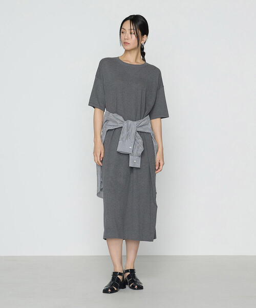 《デザイン》Vガゼットがポイントのニットワンピースです。身幅とアームホールがゆったりとし、Iラインシルエットで身体のラインをひろいにくいのが特長です。抜け感のあるドロップショルダーでリラックスした着心地です。《素材》強撚糸を使用しシャリっとした肌触りが特長の糸です。肌離れが良く、ドライタッチで快適に着こなせます。お手入れ:手洗いOK