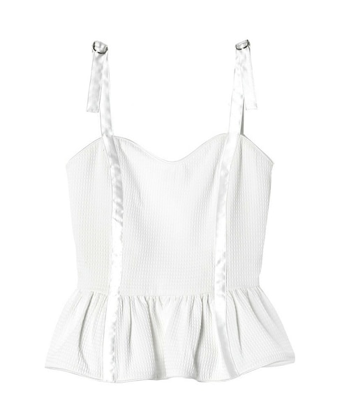 ワッフル調の生地が涼しげなビスチェトップス。 裾などに施されたコードパイピングが生地に張り感を出し上品なイメージに。 後ろはシャーリング仕様になっており、フィット感も抜群です。 短過ぎない丈感は様々なボトムスに合わせやすく、インナーにTシャツ等を合わせるのもおすすめです。