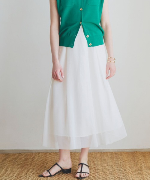 メッシュのシアー感が軽やかなスカート 【point】 ・細かいギャザーで広がりすぎず、落ち感のあるシルエット ・腰回りをカバーしてくれ、ラクチンながら上品に着れるアイテムです ・裾だけ抜け感があるので足元に抜け感がうまれます 【fabric】 ・さらっとした肌触り ・軽い履き心地なので夏も涼しく着られます 透け感:表地あり 裏地:あり 伸縮性:なし 光沢感:なし 生地の厚さ:やや薄手 【注意事項】 ・画像の商品はサンプルです。 実際の商品と仕様、加工が若干異なる場合があります。 ・サイズ表記はあくまで目安となります。 ・取り扱いについては、商品についている品質表示でご確認ください。 ・照明の関係により、実際より明るく見える場合がございます。またパソコンなどの環境により、製品と画像のカラーが若干異なる場合がございますので、予めご了承くださいませ。 ■お気に入り登録がオススメです!■ 《商品のお気に入り登録》 カラー・サイズ選択の横の「♡」をクリックで簡単に登録できます 完売カラーの再入荷や在庫が1点になったとき、セールになったときに通知をお届けします 《ブランドのお気に入り登録》 ページ上部のブランド名の「♡ お気に入りブランドに追加」をクリックで簡単に登録できます 新商品の情報やイベントなどお得な情報をいち早くお届けします 是非、ご登録お願いします♪