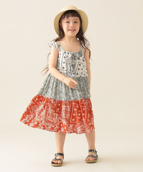 夏映え!ティアードで魅せるバンダナ柄 異なるバンダナ柄をティアードで切り替えた、おしゃれなワンピース。涼しげで軽やかな素材感で着心地も快適。肩フリルで愛らしいアクセントを加えています。さらっと一枚ではもちろん、Tシャツとのレイヤードコーデもおすすめ。映えるスタイリングが叶う、夏のおすすめアイテムです。 WHITE/OLIVE/ORANGE Model:H105(cm)Size:110 BLACK/WHITE/PINK Model:H115(cm)Size:110 ※光の当たり具合やパソコンなどの閲覧環境によって実際の色味と異なって見える場合がございます。予めご了承ください。 ※商品の色味は商品単体で撮影した画像をご参照ください。 BEAMS mini / ビームス ミニ 〈BEAMS mini〉は、太陽が似合うような元気なカラーリングを大切に、ベーシックアイテムに適度なファッション性を加えた子ども服。子どもが服や生活を楽しんでいる様子を見て、大人もつられて遊びはじめてしまうような、エンターテイメントな楽しさが溢れています。価格とデザインのバランスでお客様の琴線に触れる「着て楽しい、見て楽しい子供服」を提供します。