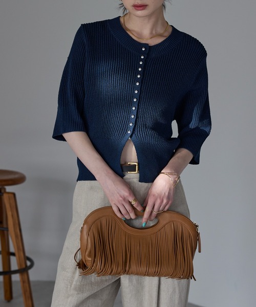 軽やかに着こなす、大人のためのサマーニットカーディガン ■Detail ミニスタッズボタンがアクセントになった、クルーネックデザインの5分袖カーディガン 軽やかなサマーニット素材で、暑い季節にもぴったりのアイテムです コンパクトな丈感に、程よくゆとりを持たせた身幅が大人の女性にぴったりのバランスを実現 フロント裾にスリットを入れたデザインで、すっきりとしたシルエットを作り、スタイリングがより洗練されます シンプルながらもディテールにこだわりを感じさせる1枚 カジュアルにも、ちょっとしたお出かけにも、どんなシーンにも合わせやすい万能カーディガンです ■Styling スッキリと着用できる丈感とサイジングなのでどんなボトムスとも合わせやすい1枚 フレアスカートやナロースカートと合わせて女性らしく ワイドパンツやデニムと合わせてカジュアルに着こなすのも◎ ■Material タオル地のような柔らかな生地感です 裏地:なし 透け感:なし 伸縮性:あり 生地の厚さ:普通 ※詳しいお手入れ方法は商品タグをご参照ください。 カーデ/コンパクトカーデ/5分袖カーデ/サマーニット/パイル地/デイリー/高見え/ シンプル/着回し/春/夏/きれいめ/きれいめカジュアル/カジュアル/オトナカジュアル/大人カジュアル/高級感/華やか 【Information】 ◆《お気に入り登録》がオススメ◆ ・「商品のお気に入り登録」で再入荷通知や、ラストの通知、セール通知も受け取ることが出来ます。 ・「ブランドのお気に入り登録」で新商品や再入荷など、お得な情報を受け取ることが出来ます ※撮影時のライティング、ご覧になっているモニター・PC環境により、実際の商品と色味が異なって見える場合がございます。予めご了承をお願い致します。 ※ご注文いただいた予約商品のお届け時期の確認は、注文履歴ページより行えます。