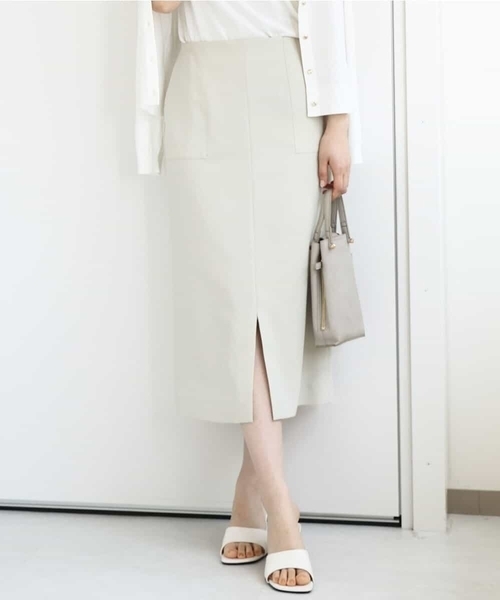 美シルエットとラクな履き心地が嬉しい ■デザイン 長めの丈が大人っぽい印象のIラインシルエットのスカート。裾にスリットが入っているので、タイトなシルエットながら足さばきの良さも◎。後ろウエストはゴム入りなのでラクな着心地も嬉しい。 ■素材 リネンライクファブリックを使用。ドライタッチな肌触りですが、シワになりにくく扱いやすさも魅力の素材です。 ■コーディネート きれいめもカジュアルもどちらのコーディネートにもマッチするスカートは汎用性抜群。Tシャツやブラウスなどどんなトップスとも好相性で着こなせます。■スタッフ着用コメント身長:152cm /体型:普通 /普段着用サイズ:38 /骨格:ストレート着用サイズ:M /着用カラー:ブラウン(87)ストレッチ性抜群なタイトスカート。ストレッチ性抜群×前スリットデザインで足さばきも快適。スリットも深くないので、お仕事シーンも気にならず、お試しいただけます。嬉しいポケット付きです。着丈は152cmの私で膝下15cmぐらいの長さでミモレな丈感でした。 -------------------- 着用シーズン 春:○ 夏:◎ 秋:△ 冬:×#オフィスカジュアル #食事会 -------------------- 洗濯表示:洗濯機洗い可 透け感:なし 裏地:あり 伸縮性:なし ウエスト:後ろゴム仕様 生地の厚さ:ふつう -------------------- ※自然光・照明の関係、パソコン・スマートフォンなどの環境により、実際と色味が違って見える場合がございます。予めご了承ください。商品の色味は、詳細画像をご参照ください。 ※サンプルでの撮影となるため、実際にお届けする商品と仕様やサイズが異なる場合がございます。--------------------■気になるアイテムは『お気に入り登録』が便利!<お気に入り登録とは?>気になるアイテムの「ハートマーク」をクリックするだけで、簡単にリストに追加できます。<おすすめポイント>1.ラスト1点や再入荷の通知を受け取ることができます。2.登録していただいた商品だけが対象となる、あなただけのタイムセールが開催されます。3.マイページの一覧からお気に入りをまとめて確認でき、自分だけの欲しいものリストがつくれます。