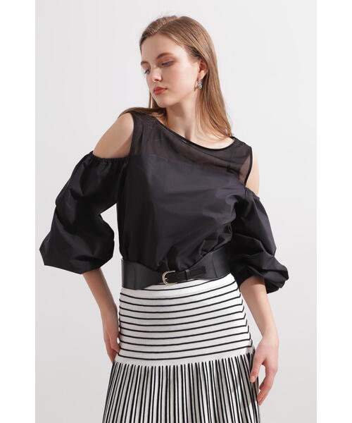 シアー素材とタフタのようなハリ感のあるカットソー素材をドッキングしたエレガントなトップス シアー素材がデコルテラインを美しく引き立て、オフショルダーとバルーンスリーブが華やかな印象を演出します。 袖口はゴム仕様で、長さの調整も自在。立体的なシルエットが生み出すボリューム感で、大人フェミニンなスタイルを叶える一枚です。 【素材説明】 スーパーハイゲージな編み機で編み上げた優れたストレッチ性を持つジャージ素材。繊細な光沢感と、ジャージとは思えない高密度な表面感が特徴。 【商品特性】 ストレッチ性あり/裏地なし/あき無し/かぶって着用 ◆お買い物をよりお楽しみいただくために◆ ・「商品のお気に入り登録」で完売カラーの再入荷やラスト1点、セール通知を受け取ことができます。 ・「ブランドのお気に入り登録」で新商品の入荷情報など、いち早く受け取ることができます。
