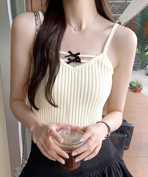 胸元リボンでガーリー気分盛り上げ♪サマーニットキャミソール 夏に大活躍!サマーニットのキャミトップス新登場! デコルテを飾るミニリボンがガーリーカジュアルにぴったり♪ 凹凸感のあるリブ編みが縦ラインを強調しすっきり見え◎ 伸縮性良くサラッとした肌触りのサマーニットがこれからの季節にヘビロテ間違いなし! ■生地感:普通のサマーニット ■伸縮性:あり ■透け感:ややあり ■裏地:なし ■ポケット:なし ■その他仕様:なし ※平置き採寸になります。若干の誤差が生じる場合がございます。 ※輸送時による、多少の汚れ・シワがある場合がございます。 ※撮影時のライティング、ご覧になっているモニター・PC環境により実際の商品と色味が異なって見える場合がございます。ご了承の上お買い求め下さい。