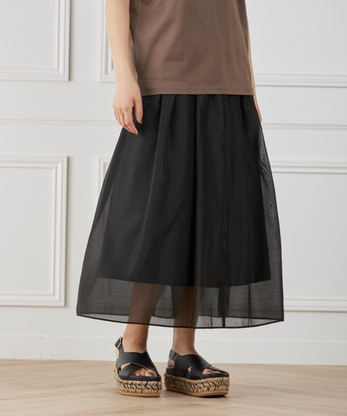 ■デザイン繊細な透け感と清涼感があり、夏のコーディネートにぴったりのアイテムです。たっぷりとギャザーを寄せたボリュームシルエット。ウエストにはピンタックを入れてアクセントにしています。綺麗目に合わせてたりデイリーに取り入れても上品に彩ってくれます。■素材柔らかくさらりとした肌触りと光沢、絶妙かつ繊細な透け感が魅力的なポリエステルオーガンジー素材。・裏地あり・ポケットあり・ウエスト後ろ部分ゴム仕様・後ろファスナーあり・水洗い可■サンプル撮影商品■こちらの商品はサンプルでの撮影となっております。実際の商品とは、サイズや色味、素材、デザイン等の仕様が若干変更になる場合がございます。