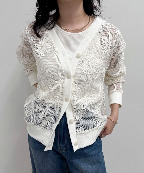 ◇fredy emue◇【2025 SS】フラワー刺繍が目を惹くVネックカーディガン●point・フラワー刺繍がこなれた印象に導いてくれるカーディガンです・透け感のあるメッシュ地に刺繍をプラスした目を惹く1枚・同色の刺繍で派手過ぎず、デイリーに取り入れやすい1枚です・顔周りがすっきり見えるVネックデザイン◎・幅広いボトムスと合わせやすい丈感で使い勝手の良さもポイントです・透け感を活かしてタンクトップやキャミソールなどと合わせた爽やかな着こなしがオススメ!・風通しが良く、羽織りとしても使えるので、これからの春夏シーズンに重宝すること間違いない1枚です透け感:あり裏地:なし伸縮性:ややあり光沢感:なし洗濯:手洗い可●お取扱い上のご注意●*商品を長くご愛用していただきたいため、アテンションタグがある場合は必ずご確認の上、着用又はお取り扱い下さい。*画像の商品はサンプルとなりますので実際の商品と仕様(主にファスナー・釦等の付属品)、加工、サイズが若干異なる場合がございます。*店頭及び屋外での撮影画像は、光の当たり具合で色味が違って見える場合があります。商品の色味は、スタジオ撮影の画像をご参照下さい。*商品画像に関しては出来る限り忠実に表示出来るよう努めておりますが、お客様がご利用のモニターの設定及び特性により、実際の商品と比較し色味に若干の誤差が生じる場合があります。*製品洗い加工の商品は、多少の歪み、シワなどが見られたり、風合いやサイズ等が1枚1枚異なります。汗や雨等で濡れた時や、摩擦により色落ちし、他の衣料を汚すことがありますので(特に濃色のもの)ご注意ください。※サンプルでの採寸のため、サイズ表はあくまで目安となります。予めご了承ください。◇商品のお気に入り登録◇気になる商品は、お気に入り登録がオススメです!クーポン情報、入荷情報が、通知されるようになります。