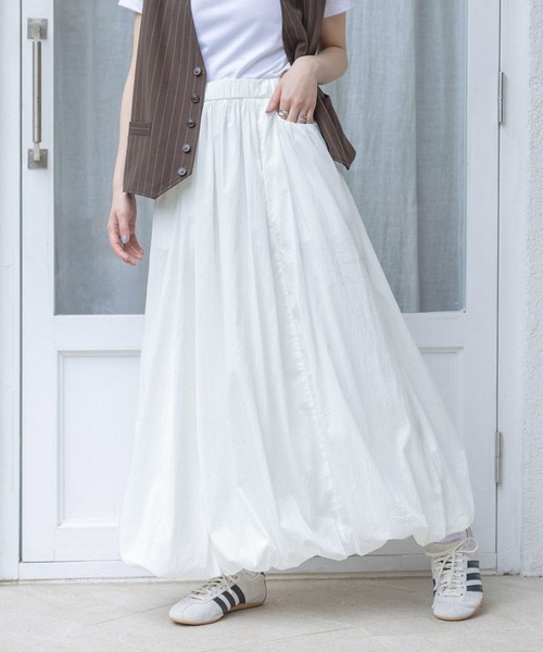大人気のバルーンスカートがレベルアップして登場。 ■おすすめの着こなし ☆きれいめなスタイルには・・・ シンプルなTシャツにシャツやジャケットを羽織った大人っぽい着こなしがおすすめです◎ ベストやジレなどの抜け感のあるアイテムと合わせてることで、女性らしい印象で着用いただけます。 ☆トレンドライクな着こなしには・・・ コンパクトトップスと合わせた、メリハリのあるスタイリングがおすすめです。 ボリュームのあるスカートなので、ショート丈のトップスと合わせることでバランスの良いスタイルが叶います◎ ーーー ■ポイント ボリュームたっぷりのふんわり感がフェミニンなバルーンスカート。 こだわりのウエストギャザーでボリューム感・美シルエットを両立させた一着です◎ ウエストゴムのイージー仕様なので、ノンストレスな着心地に。 サラッとしていて軽やかな素材にバージョンアップし、暖かい時期でも快適に着用いただけます。 腰回りや太ももなどの下半身をしっかりカバーしてくれるのも嬉しいポイントです。 ■素材 さらっと軽やかなコットンとナイロンの混紡素材を使用。 柔らかく、程よいハリのある生地感なので、着心地も抜群です。