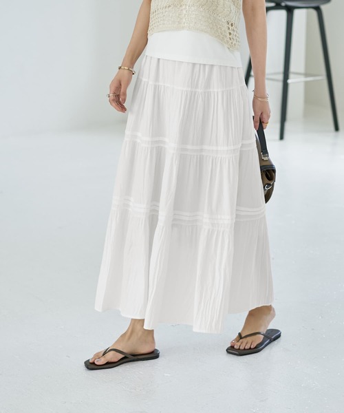 さりげなく凝ったデザインも◎ コーデが華やかになるボリューム感 涼し気で爽やかなホワイトロングスカート 【この商品の特徴】 ◆白シャツの生地で仕立てた、イノセントな雰囲気のロングスカート。ほど良くボリューム感があり、華のあるデザインです。 ◆見た目や肌触りはコットンの白シャツ生地ですが、その質感はポリエステルで表現。実際にコットンにするとシワが強く扱いづらくなってしまうため、質感だけを取り入れています(最近の技術では、ポリエステルでこの質感を出すことができます)。 ◆4段構成のティアードスカート。3段目と4段目には区切り目のところにタック線で立体感を出した、さりげなく凝っているデザインの珍しいティアードです。 ◆ウエストは全周ゴム。見えても違和感の無いゴムなので、トップスを裾インしてもOK。ひっくり返りにくいゴム仕様になっており、位置を少し落として穿いたりの丈感調節も簡単にできます。 ◆透け感が気になる白スカートですが、こちらはベージュ色の裏地を入れて透けにくいよう配慮。黒などの下着は一応避けた方が良いかもしれませんが、大体の下着は大丈夫なので便利です。 ◆お色はごく定番的な白シャツのホワイト。イエロー味や赤味、こっくりとした色味感などはない、普通の白さのホワイトです。 ◆多少のシワはできますが、デザインの一部に溶け込みそれが雰囲気となるような、気にならない感じのシワ感。あまりにもシワが無いとこなれ感が無くなり垢抜けなくなりますので、ちょっとシワがあるくらいがベストです。 ◆ロゴTシャツやタンクトップ、ロックTやスニーカーのような、カジュアル感のあるものと合わせるのがイチオシ。その他スタイリッシュなジャケットやベスト、シンプルな夏ニット類など、甘さが無い物やメンズ要素があるものと合わせることで、洗練されたバランスのコーディネートが楽しめます。 ◆真夏に対応の軽くてサラッとした素材感。風通りが良く吸水速乾性もあり、比較的涼しくご着用いただけます。 ◆お素材的には春夏物ですが、最近は冬場のニットにこのようなスカートを合わせるのもオシャレとして普通になっていますので、そういうファッション的な意味合いでは通年でお使いいただけます。 【その他の仕様や情報】 ◆着用シーズン:春夏をメインにお好みで通年 ◆サイズ感:ゆとりのあるサイズ感 ◆丈感:くるぶし程度のロング丈が基準 ◆ウエスト仕様:全周ゴム ◆ボタンやファスナー等:なし ◆付属品:なし ◆ベルトループ:なし ◆ポケット:なし ◆透け感:なし(表地は透けますがベージュの裏地でカバーしています) ◆伸縮性:なし ◆光沢感:なし ◆厚さ:薄手寄りの普通(白シャツ程度) ◆柔らかさ:柔らかさはなく、薄くてスムースなハリ感がある感じ。硬さはありません。=そのへんは白シャツと同じです。 ◆シワ:多少はできるが気にならない程度 ◆毛羽立ち:基本的にできない ◆肌触り:サラっとして軽やかなハリ感がある感じ ◆アイロン:不要(霧吹き向き) ◆スチーマー:使用OK ◆備考:シワが気になる際は、霧吹きをかけて湿らせ、ハンガーにかけておけばOKです。