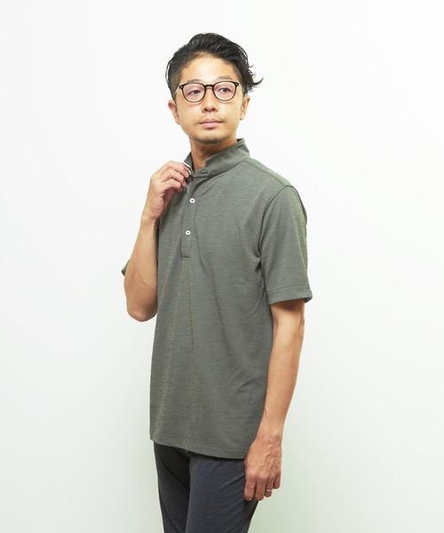 上品なカジュアルスタイルを楽しむ『キレイめポロシャツ』 <デザインの特徴> 麻調機能ジャージ素材を使った半袖ワンピースカラーポロシャツです。 小ぶりなワンピースカラーのポロシャツは、特徴的なワイヤー入りの衿が印象的な存在感抜群なポロシャツです。 袖口裏に別生地を使いさりげないアクセントにしています。 <素材について> 触れた瞬間に分かる軽やかさと清涼感ある麻の肌触りが特徴的なジャージ素材で染め分けにより千鳥柄を表現しました。 ジャージ特有の柔らかさと28Gというハイゲージの為、型崩れしくにいのも特徴です。 2WAYストレッチ、吸水速乾、通気性、防シワ、ウォッシャブルを持つ多機能素材です。 <サイズ感・シルエットの特徴> シルエットは程よくスリムに仕上げており、スマートな着こなしを演出してくれます。 <サイズ表記> 2=S、3=M、4=L、5=XL