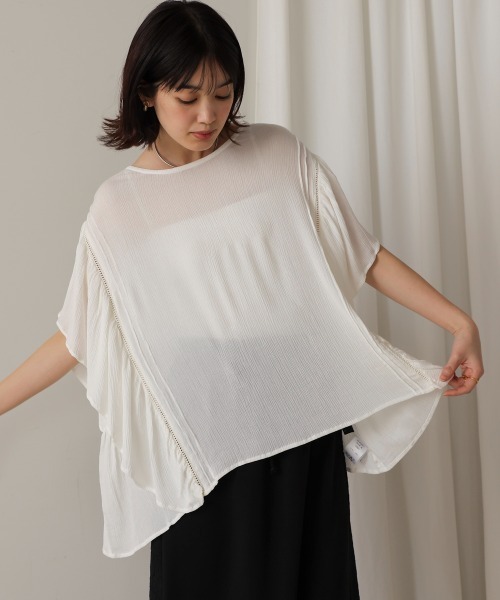 ■POINT とろみ感のあるレーヨン素材を使用した女性らしい一枚は、軽くて涼しいのが特徴です。サイドの切り替えにハシゴレースを使用するなど、シンプルながらも細部までしっかりこだわりました。 ■FABRIC 落ち感のある生地を使用し、ゆとりのあるサイズ感でもスッキリ見えるシルエットになっています。お袖も長めなので気になる二の腕もカバーできます。 ………………… 透け感:あり 裏地:なし ………………… ★商品のお気に入り登録 登録すると、完売しても再入荷時に通知を受け取ることができます。 ほかにもお得な特典があるかもしれません♪ ★ブランドのお気に入り登録 新商品や再入荷などの情報を受け取ることができますので、是非ご登録ください♪