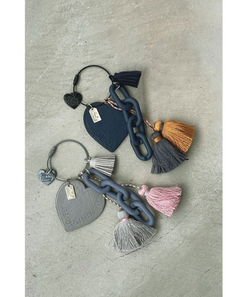 ♡とチェーン、フリンジのバッグチャーム。 大きめなチャームはひとつだけで存在感が。 小ぶりなバッグにはもちろん、トートバッグなどの大きめなバッグにもおすすめ。 カラビナでなく輪のパーツなのでハンドルが太くても問題なく付けることができて安心。 ハートは大きいものがフェイクレザー、小さいハートはメタル製。 フリンジは刺繍糸のような柔らかい質感でチェーンはマットで軽い材質のパーツです。