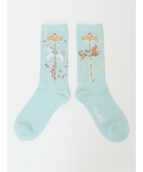 merry-go-round お洋服をメリーゴーランドに見立てたロマンティックでクラシカルなパネルプリント。夢とお花がたっぷりと詰め込まれたメリーゴーラウンド。 終わりがない、回り続けるその姿に、ピンクハウスもずっと続いて欲しいという願いを込めながら・・・ 装飾的なディテールがふんだんに繰り広げられるカセットに。 プリントはパステルカラーを基調に、グレイッシュトーンも加わりメルヘンチックながらもクラシックな印象に。 ゴールドのポールに戯れるつるばらにデイジー。ネモフィラ畑から花々を運ぶポニーや、つるばらでお洒落したポニー。 そんな木馬たちを追いかけて遊ぶ猫の姿も・・・ぐるりぐるりと楽しく回っています。 メリーゴーラウンドプリントから、つるばらでお洒落したポニーをモチーフにしたソックス。 サテンリボンを添えてアクセントにしています。