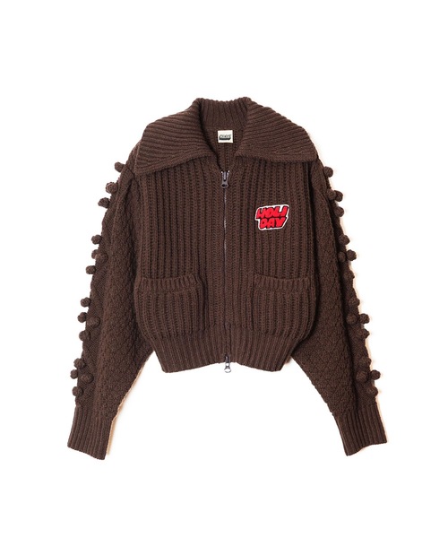 太番手のウール100%の糸を使用したローゲージのケーブル編みニットジャケット。コンパクトな着丈にダブルジップ仕様です。ロゴワッペンと袖のポンポンデザインがポイント。同シリーズのニットキャップとあわせたスタイリングもおすすめです。