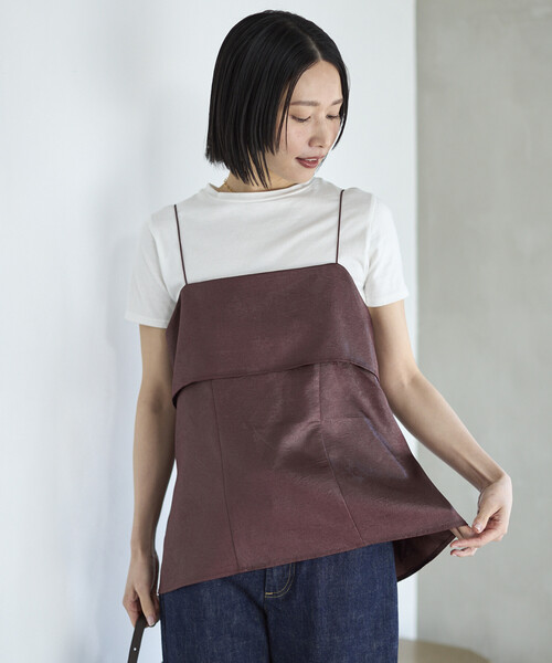2025 Spring & Summer item チンツ加工されたレザー見えするサテン素材を使用したキャミソールトップス ●バックオープンデザインで後ろ姿もぬかりなく、コーディネートのポイントに ●後ろがゴム仕様なので着脱も楽で、締め付けもなく着心地◎ ●ふわっとさりげなく広がるフレアシルエットで女性らしいスタイルにぴったり ●レイヤードに最適なキャミトップスなので、インナー次第でオールシーズン着て頂けます ●普段のコーデに+1するだけでおしゃれ見えする、ワードローブに加えたいアイテムです おすすめコーディネート 夏はカジュアルなTシャツやタンクトップの上にレイヤードしたスタイルがおすすめ。デザイン性◎なアイテムなのでシンプルなスタイルに取り入れるだけでおしゃれ見えします。 ボトムを選ばない丈感とシルエットなので、カジュアルなデニム合わせはもちろん、Iラインシルエットのスカートなど女性らしいボトムス合わせもおすすめです。 同素材のワイドパンツとセットアップでの着用も◎。 ※同素材アイテム 3442234400023:チンツ加工 イージーワイドパンツ ※肩紐長さ:38.5cm ※掲載画像の商品の色味は、屋外や屋内の光の照射や角度により実物と色味が異なる場合がございます。 また表示のサイズ感と実物は若干異なる場合もございますので、予めご了承ください。 ※着用、お取り扱いの際は、商品についている品質表示とアテンションタグを必ずご確認下さい。 【Firsthand / ファーストハンド】 Fashion , Sustainable , Art をテーマに、デザイン性やクォリティー、モノ作りなど、クリエイティブを重視したサステナブルなコンセプトストア。 ここでしか出会えないブランドやアイテム、ここでしかできない実体験、新しくスタイリッシュなカルチャーとファッションをここから発信していきます。 フリークスストア等を構えるデイトナインターナショナルから新たに発信されるブランドです。