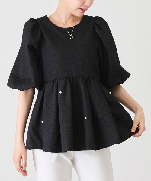 【デザイン・シルエット】フクレジャガードで存在感抜群のブラウス。ペプラムシルエットで可愛らしい着こなしが叶います。ランダムに施されたパールもポイントに。ボリュームのある袖も華やかさをプラスします。【素材感】ハリのあるふくれジャガード生地【カラー】01クロ 11シロ【スタイリングポイント】シンプルな細身のボトムと好相性。デニムやペンシルスカートに合わせるのがおすすめです。裏地:袖、肩からウエストにかけてあり光沢感:なし透け感:シロ若干ありポケット:なし伸縮性:なし生地の厚さ:普通ボタン:なしその他仕様:後リボン季節:春夏秋※撮影時の光、お使いのモニター環境によって色の見え方が違う場合がございます。予めご了承ください。モデル身長:168cm 着用サイズ:M