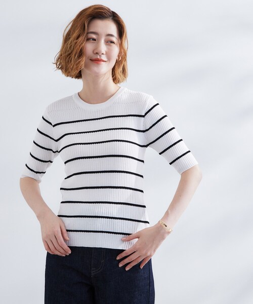 さり気なくお洒落見え ベーシック5分袖ニットプルオーバー 【デザイン】 ボーダー調の編地変化を入れたベーシックリブプルオーバー。 リブ編みで適度に身体にフィットするすっきりしたシルエット感です。 ワイドピッチのボーダー調の編地がポイントで、無地でもボーダー見えするのが特徴。 春から秋まで比較的長く活躍できる5分袖丈は、何枚持っていても便利なアイテムの一つです。 【素材】 さらりとしたドライタッチのレーヨン混糸を使用。 編地変化部分に配色を入れてボーダーと無地の展開です。 【スタイリング】 ワイドパンツやボリュームのあるスカートと合わせて、メリハリのあるスタイリングバランスがおススメです。 トレンドのキャミやジレ、吊ボトム等のインナーとしても◎ ※製品寸法は平置きのスペックとなっております。こちらの商品は伸縮性があります。 ※照明の関係により、実際よりも色味が違って見える場合があります。また、パソコン・スマートフォンなどの環境により、若干製品と画像のカラーが異なる場合もございます。 【25SS】 モデル情報:身長166cm B80 W59 H86 着用サイズ:02(M) 店舗へのお問い合わせ商品番号:768-12074 ●製品寸法: 01(S):着丈53cm B67cm 袖丈27cm 肩幅32cm 02(M):着丈55cm B70cm 袖丈28cm 肩幅33cm 03(L):着丈57cm B73cm 袖丈29cm 肩幅34cm 04(LL):着丈59cm B76cm 袖丈30cm 肩幅35cm 05(3L):着丈61cm B79cm 袖丈31cm 肩幅36cm 備考: