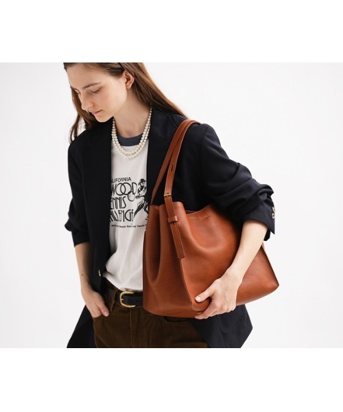 歴代のミネルヴァボックスを使用してきたシリーズのなかで、とりわけ“軽快”さに焦点をおいて作られたシリーズ。革の良さを損ねないよう薄漉きした一重のボディを、四つ角のハンドルで釣り上げることにより全体に「たわみ」感が生まれ、ミネルヴァの革の一見硬質な革にドレープ性が生まれます。その結果、従来の同容量のバッグより軽妙、かつ体馴染みが良い仕上がりに。自然な口前のたわみで、荷物が覗かれにくい点もポイント。精緻な手仕上げの天地調整用の真鍮Hカンや、外縫いのストレートなカッティングの切り目が 、味のあるオイルアップレザーを引き立てつつ、垢ぬけた見た目の“軽快”さの演出も実現。最も「革らしい革」の王道たるミネルヴァを、よりシャープでクリーンにまとめた意欲作です。<素材の特性・メリット>原皮: フランス(ノルマンディ産) 鞣し加工:イタリア 鞣しの種類:タンニン鞣し素材:ミネルヴァボックス<取り扱いの注意・お手入れ方法>牛革:アメダス○ デリケートクリーム○ コンディショニングクリーム〇 泡クリーム○・横幅(W):上部32cm下部32cm・高さ(H):27.5cm・マチ(D):20cm・持ち手:44~58cm・重さ:775g・外ポケット数:1・内ポケット数:3・持ち手立ち上がり:18~28cm
