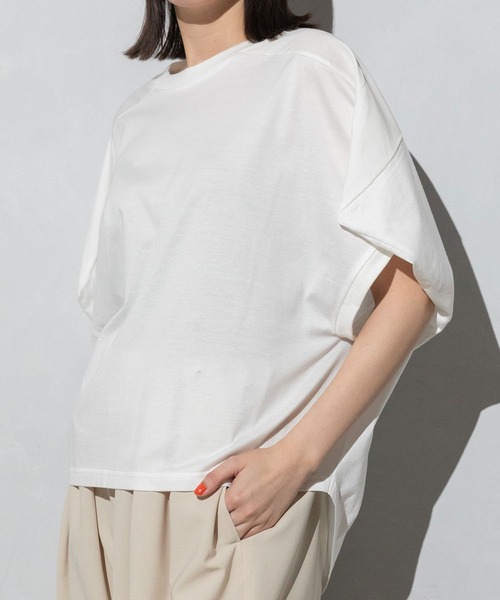 ■2025 SPRING SUMMER collection■-MM COORDINATION-カットソー×布帛のコンビネーションブラウス見えするきれいめTシャツ肩先を布帛で切替えた立体的な膨らみのディティールがポイントのTシャツ。袖から下着が見えないように袖口は締め付け感のないリブ仕様になります。後身頃ヨーク下にタックを入れたブラウスのような見え方がポイント。後下がりの丈感は気になる部分をぼかしボトムスも選びません。1枚で存在感がありモードな印象も共存するアイテムです。【DESIGN】■衿ぐりは開きの少ないクルーネック■身体のラインをひろわないゆったりとしたシルエット■きちんと感のある表面感とデザイン■後ろ下りのやや長めの丈感■ボーダーのみ袖口のリブが配色【MATERIAL】(表地)光沢がありハリ感ある風合いの60/2天竺を使用・双糸使いすることで生地の斜行を抑え美しい編み目を表現した素材・シルケット加工により毛羽の少ないソフトな風合い(別地: 肩)微光沢の50Sブロードストレッチを使用・スパンデックス繊維を利用した、伸長回復効果のある素材--------------------------裏地:なし光沢感:微光沢あり透け感:なし(o/whtは若干の透け感あり)伸縮性:あり生地の厚さ:薄手ケア方法:ホームクリーニング(手洗い)--------------------------◆お取り扱いについては商品についております品質表示にてご確認下さい。*光のあたり具合いやパソコンなどのモニター環境によって実際の色味と異なって見える場合がございます。予めご了承ください。*撮影時はサンプルの為、若干のデザイン変更等ある場合がございます。予めご了承ください。<INFORMATION>◆商品のお気に入り登録お気に入り登録していただいた商品は、完売商品の再入荷通知やラスト1点の通知、またクーポン発行やタイムセールの通知もお届け!ぜひご登録してください。◆ショップ・ブランドのお気に入り登録新商品や再入荷、ショップ・ブランドのお得な情報をいち早お届け!ぜひご登録してください。