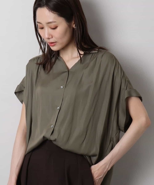 セットアップでの着こなしも楽しめる 定番人気のブラウスが今年も登場 ■デザイン 肩と背中部分のたっぷりのギャザーが女性らしいブラウス。フロントの華奢なミニメタル釦がアクセントに。前後差のある着丈がバランス良く着こなしやすく、首元部分もよりすっきりときれいに見えるようデザインが人気のMKの夏の定番ブラウスです。裾を内側の釦で留めるとウエストインしたようなシルエットでも着こなせます。 ■素材 きれいな落ち感とさらりとした素材感にカジュアルすぎないきちんと見えのサテン素材を使用。軽さのある素材感は3シーズン長く着回し可能。接触冷感機能付き。 ■コーディネート ボトムを選ばず、インでもアウトでも決まります。同素材のスカート見えガウチョパンツとセットアップでワンピース風の着こなしも◎。 -------------------- 着用シーズン 春:○ 夏:◎ 秋:△ 冬:× -------------------- 洗濯表示:手洗い可 透け感:なし(淡色はややあり) 裏地:なし 伸縮性:なし 生地の厚さ:やや薄手 -------------------- ■スタッフ着用コメント <スタッフ身長:157cm/着用サイズM(38)/普段の着用サイズS(36)~M(38)> ひんやり接触冷感素材がうれしい、軽い着心地のサテン地ブラウスです。素材感は薄手ですが透け感はなく、落ち感のあるシルエットですっきり着られました。サイズ感はゆったりめで身体が泳ぐくらいのゆとりがありましたが、脇下が開きすぎないのも◎。シワにもなりにくいので、毎日のお仕事はもちろんご旅行にも便利な一枚です。 <スタッフ身長:157cm/着用サイズM(38)/普段の着用サイズM(38)> 軽くてひんやり涼しい、夏の定番サテン素材。アクセントになるメタルボタンは着脱しやすく羽織り代わりにも使える一枚です。素材の光沢感で肌がきれいに見えるのもおすすめポイント!毎シーズン大人気の同素材のガウチョパンツとセットアップ着用で夏のお出かけにも使えるきれいめスタイルを楽しめます。 <スタッフ身長:174cm/着用サイズM(38)/普段の着用サイズM(38)~L(40)> MK定番人気のブラウス。キレイな落ち感とサラリとした素材感が特徴で、体のラインを拾わずスッキリ見せてくれます。着丈も長めなのでボトムを選ばずコーディネートしやすいのもポイントです!襟付きなのできちんと感あり。お仕事にも最適です! -------------------- ※自然光・照明の関係、パソコン・スマートフォンなどの環境により、実際と色味が違って見える場合がございます。予めご了承ください。商品の色味は、詳細画像をご参照ください。 ※サンプルでの撮影となるため、実際にお届けする商品と仕様やサイズが異なる場合がございます。