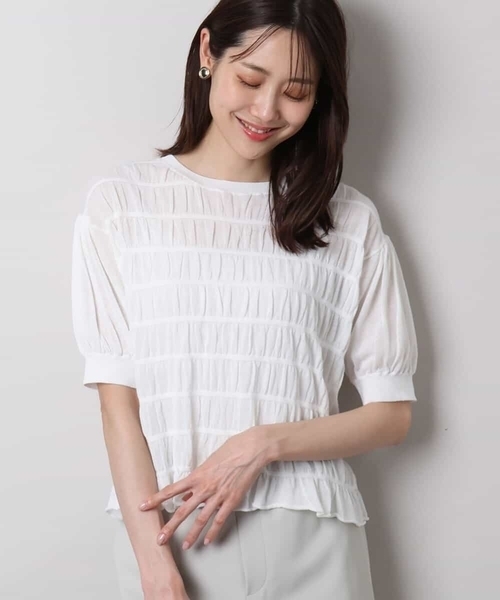 シャーリングデザインが大人可愛い ■デザイン ややシアー感のある薄手素材が涼しげな印象のサマーニット。シャーリングデザインがすっきり見えを叶えながら体のラインを拾いすぎず着こなしやすいシルエットが嬉しい。甘くなりすぎないドロップショルダーデザインで仕上げました。 ■素材 ハイツイストで細番手のコットンナイロン糸を使用。ボーダー状にストレッチ糸でシャーリングを寄せたこだわりの編地です。袖部分はシャーリングを寄せず、シアー感のある天竺組織に。 ■コーディネート やや短めの着丈はワイドパンツやスカートなどボリュームのあるボトムにインしなくてもバランス良く着こなせます。二の腕がしっかりと隠れる袖丈ですが、ほんのりシアー感があるので涼しげに着こなせるのも嬉しい。同素材のカーディガンもご用意しているのでアンサンブルとしても着用可能です。 -------------------- 着用シーズン 春:○ 夏:◎ 秋:△ 冬:× -------------------- 洗濯表示:手洗い可 透け感:ややあり 裏地:なし 伸縮性:あり 生地の厚さ:やや薄手 -------------------- ■スタッフ着用コメント <スタッフ身長:164cm/着用サイズM(38)/普段の着用サイズS(36)~M(38)> 涼しげな印象を与えつつ、体のラインをきれいに見せてくれるシルエット。ガーゼのような肌触りで優しい着心地◎洗える素材でお手入れも簡単。インをせずに丁度良い着丈が嬉しい!お揃いのカーディガンと合わせてアンサンブルにも。 <スタッフ身長:156cm/着用サイズM(38)/普段の着用サイズS(36)~M(38) > シャーリングデザインが大人可愛いニット。柔らかい素材が体のラインを拾いすぎず着こなしやすいです。ワイドパンツやボリュームのあるスカートと相性抜群です。 <スタッフ身長:154cm/着用サイズM(38)/普段の着用サイズM(38)> ややシアー感のある薄手素材で、涼しげな印象を与えつつ、体のラインを美しく見せます。重ね着はしたくないけれど、Tシャツ一枚で過ごすのは物足りない方という方にぴったり。 -------------------- ※自然光・照明の関係、パソコン・スマートフォンなどの環境により、実際と色味が違って見える場合がございます。予めご了承ください。商品の色味は、詳細画像をご参照ください。 ※サンプルでの撮影となるため、実際にお届けする商品と仕様やサイズが異なる場合がございます。