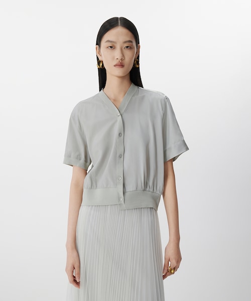 異素材のコンビネーションが映える、洗練カーディガン。左右で異なる素材をドッキングし、モダンな印象に仕上げました。袖口や裾、前立てには柔らかなニットを使用し、心地よい肌触りと快適な着用感を実現。上品なシルクの光沢がさりげない華やかさを添え、オンオフ問わず、さまざまなシーンで活躍します。※ドライクリーニングのみ可能 JN79 5P4213270 #ブラウス#カーディガン#シルク#グレー#ブラック