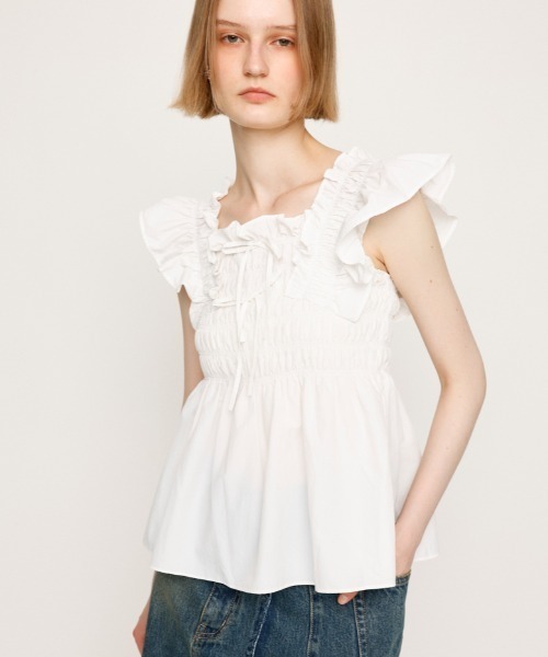■POINT:アーム部分にボリューム感のあるフリルをあしらい、フロントにはリボンディテールも取り入れた女性らしい印象のトップス。■DETAIL:デコルテがきれいに見える開きと身頃とショルダー部分にシャーリングディテールを施し、ふわっと広がるシルエットで着用するだけで着映えする1枚です。またゴム仕様なのでリラックスして着用していただけます。■STYLING:デニムスタイルはもちろん、きれいめボトムにさらっと合わせるだけで様になるアイテムです。■FABRIC/MATERIAL:さらっとした着心地のナイロン素材を使用。■透け感:O/WHTのみあり■光沢感:少しあり■伸縮性:シャーリング部分のみあり■裏 地:なし●本品は素材の特性上色落ちします。洗濯、クリーニング、着用(使用)時に他の衣類や雑貨、家具類に色移りする事があります。特に汗や雨等で湿った状態では、色落ちが顕著になります。白、淡色との組み合わせは避け、お取り扱いには十分ご注意下さい。[注意事項]※画像の商品はサンプルです。実際の商品と仕様、加工が若干異なる場合があります。※画像の商品は光の照射や角度、お使いのモニター環境により、実物と色味が異なる場合がございます。※着用、お取り扱いの際は、アテンションタグをご確認ください。※一部予約商品につきましては生産上の都合によりお届け予定日や店頭発売と前後する場合もございます。※追加生産商品は、一部の店舗、通販で販売中の場合がございます。予めご了承下さい。【SLY/スライ】「Casual」「Girly」「Mode」をベースに発信する、ディテールへのこだわりが詰まった、どこか必ず女性らしさを感じるアーバンスタイル。 さまざまなエッセンスをミックスした、時代の空気を体現するコレクションを展開。 ▼商品のお気に入り登録 お気に入りアイテムの値下げ・再入荷・在庫5点などの通知を受け取ることができます。 ▼ブランドのお気に入り 登録新商品や再入荷、セール、クーポン配布などお得な情報を受け取ることができます。※こちらの商品はSLY独自の採寸方法となっています。本サイトのサイズガイドと採寸方法が異なる場合がありますのでご了承ください。