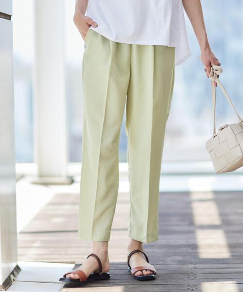 【デザインポイント】 すっきり綺麗なシルエットのテーパードパンツ。 センターライン入りなのでスマートさのある美シルエットに仕上がります。 ウエストはゴム仕様で、リラクシー感も◎ 同型(F58-63030)で秋色もお作りしております。 【スタイリングポイント】 ウエストのドロストをポイントにタックインでの着こなしがお勧めです。 【素材ポイント】 柔らかさと軽さのある涼し気な素材です。 【仕様】 ・ポケット数:横×2 後ろ(ダミー)×2 ・ウエスト総ゴム ・グレージュ(050)のみショート丈の裏地あり ※グレージュ(050)はやや透け感があります。 ※照明の関係により、実際よりも色味が違って見える場合があります。また、パソコン・スマートフォンなどの環境により、若干製品と画像のカラーが異なる場合もございます。 モデル情報:身長166cm B72 W62 H86 着用サイズ:02(M) 店舗へのお問い合わせ商品番号:F58-62047 ●製品寸法: 00(XS):W~62cm H100cm 股下60cm 前股上29cm 渡り幅31cm 裾幅16cm 01(S):W~65cm H103cm 股下61cm 前股上29cm 渡り幅32cm 裾幅17cm 02(M):W~68cm H106cm 股下62cm 前股上30cm 渡り幅33cm 裾幅18cm 03(L):W~71cm H109cm 股下63cm 前股上30cm 渡り幅34cm 裾幅19cm 備考: