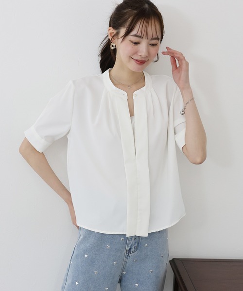 【2025SS】 オフィスからおでかけまで幅広く着まわしやすいきれいめ半袖ブラウス ◦POINT シーンや着こなしに合わせて表情を変えられる2WAY仕様の半袖ブラウス。 ボタンを閉じるときちんと感があるスタンドカラーに、 開けるとキャミソールをレイヤードしたようなすっきりとしたスキッパーネックになり抜け感のある雰囲気に。 フロント部分のタックやネックと袖口にパールボタンをあしらい、上品なポイントを加えました。 バックにはタック入りでゆとりのあるサイズ感でボディラインを拾いにくく、 胸元にはあて布があるので首元が開きすぎず、インナーを気にせずラクに着られます。 シンプルながらもおしゃれに決まるデザインなので、デイリーにも合わせやすいのがうれしいポイントです。 ◦STYLING オフィスシーンやお呼ばれの場などのきちんと見えスタイルにおすすめ◎ ジャケットやテーパードパンツを合わせてオフィスカジュアルに、ワイドパンツやデニムでカジュアルスタイルに、フレアスカートやマーメイドスカートでデートスタイルなど、 どんなボトムとも相性良く楽しめるデイリーアイテムです。 合わせるアイテム次第で、通勤・オフィスルックや 入学式(入園式)・卒業式(卒園式)・お受験・七五三などのセレモニー・オケージョン・フォーマル・パーティーなどのシーン、きれいめカジュアルにデイリーまで様々なシーンに活躍する一着です。 ◦DETAIL 2WAYネック タック入り 袖口・ネック:パールボタン ◦FABRIC 落ち感のあるポリエステル生地 [ コーディネート ] 2wayタックワイドパンツ 91144770(ZOZO)59251j6-9605(店舗) ハートスタッズデニムパンツ 87816545(ZOZO)542426-8481(店舗) フラワーレースタイトスカート 65110316(ZOZO)542214-3733(店舗) [ 商品のお気に入り登録 ] 完売カラーの再入荷通知や、値下げのお知らせ、ラスト1点の通知などが受け取ることができます。 随時再入荷していますので、お気に入り登録して頂くと再入荷情報がGET出来ます。 [ ブランドのお気に入り登録 ] 新商品の発売や再入荷、タイムセールやクーポン発行のお知らせなど BLUEEASTのお得な情報を受け取ることができます。ぜひご登録ください♪ ※撮影環境により、モデル着用画像は実際の商品と色味が異なって見える場合がございます。 また、PCやスマートフォンの環境により画面上と実物では多少色が異なって見える場合がございます。 トルソー画像が実際の商品に一番近いお色となりますのでご確認ください。