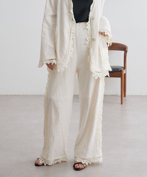 Omekashiらしさ溢れるバテンレースが華やかな印象のパンツ・バテンレースがスタイリングのポイントになる一枚。・サイドラインにもレースが施されているので、どんなトップスに合わせても大人の甘めカジュアルスタイルを楽しんでいただけます!・総ゴムのウエストとヒップやもも周りもゆったりとした作りでイージーな履き心地です◎・ロゴTシャツなどのカジュアルなアイテムとも相性抜群のアイテム。・同素材のバテンレースジャケットとセットアップで着用していただけます。・透け感:ややあり・裏地:ひざ丈まであり・伸縮性:ややあり・生地の厚さ:普通 ・光沢:なし・ポケット:あり<洗濯方法>ドライクリーニング推奨--------------------------------------------------------------------------- ・着用モデル身長:160cm / 体型:普通--------------------------------------------------------------------------- 【商品のお気に入り登録】♡をクリックで気になるアイテムをお気に入り登録していただくと、以下の通知を受け取ることができます。・入荷・再入荷・ラスト一点・セール対象時【ブランドのお気に入り登録 】 新商品や再入荷、セール、クーポン配布などお得な情報を受け取ることができます。--------------------------------------※画像の商品はサンプルです。実際の商品と仕様、加工が若干異なる場合があります。※カラーにより糸の風合いが異なるため、個体差が生じる場合がございます。※商品の色味は、撮影場所や光の当たり具合などにより色味が異なって見える場合がございます。また、お客様のお使いのPC・スマートフォン等のモニター環境などにより色味が異なって見える場合がございます。予めご了承の上ご注文ください。